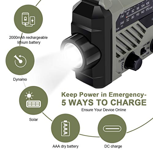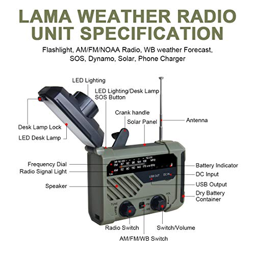 Specification: LAMA Radio AM/FM zwengelradio, noodradio, 2000 mAh, powerbank, USB oplaadbaar met handslinger, dynamo, led-lamp, leeslamp, SOS-alarm voor outdoor, wandelen, kamperen, survival, reizen, noodgevallen, legergroen